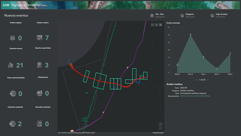 Derechos superficiales, derechos mineros, infraestructura, evaluación ambiental, normativa territorial, ámbito indígena, recursos hídricos, ámbito marítimo, geografía física, entre otros.